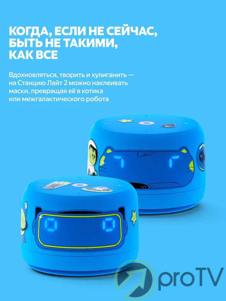 Со Станцией Лайт 2 дети могут играть, хулиганить и превращать умную колонку в необычных персонажей. Например, можно наклеить на колонку маску котика или межгалактического робота. А стикерами из набора здорово украшать и умную колонку, и всё вокруг.