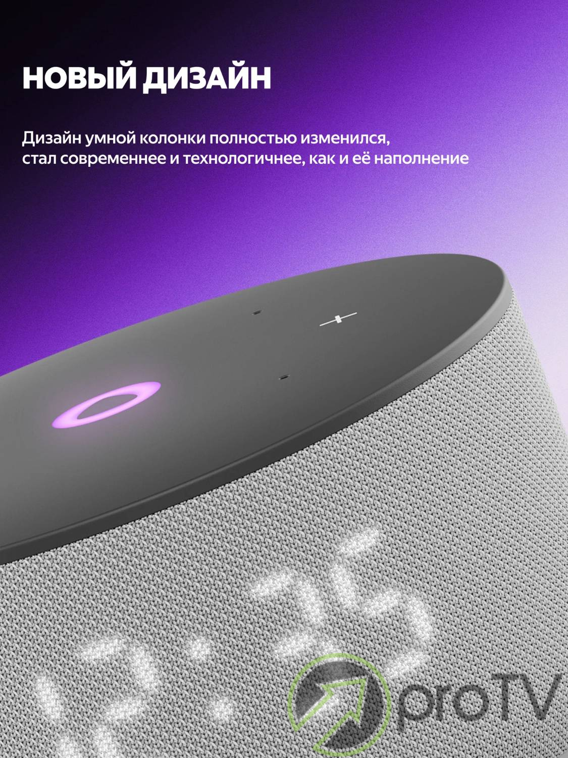Благодаря более мягкой, цельной и гармоничной форме корпуса Станция Мини 3 отлично смотрится в любом современном интерьере. Цветовая палитра умной колонки тоже обновилась: можно выбрать классические чёрный и серый, а для ценителей акцентов подойдёт пастельный фиолетовый оттенок.