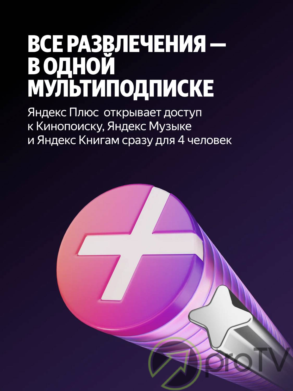 Яндекс Плюс - это виртуальное пространство в котором собраны все популярные сервисы Яндекса. Идеально сочетается с умными колонками Алиса. С подпиской вы получаете доступ к контенту Кинопоиска (а это более 7.5 тысяч фильмов, сериалов, мультфильмов), стриминговому сервису Яндекс Музыка (где собрано более 60 млн треков и подкастов). Яндекс Плюс - это развлечения в одной мультиподписке для вас и 3 близких: смотрите фильмы, сериалы, мультики, спорт на Кинопоиске (необходим VPN); слушайте музыкальные рекомендации, подкасты и аудиокниги в Яндекс Музыке; читайте книги и комиксы, а также слушайте аудиокниги в Яндекс Книгах.